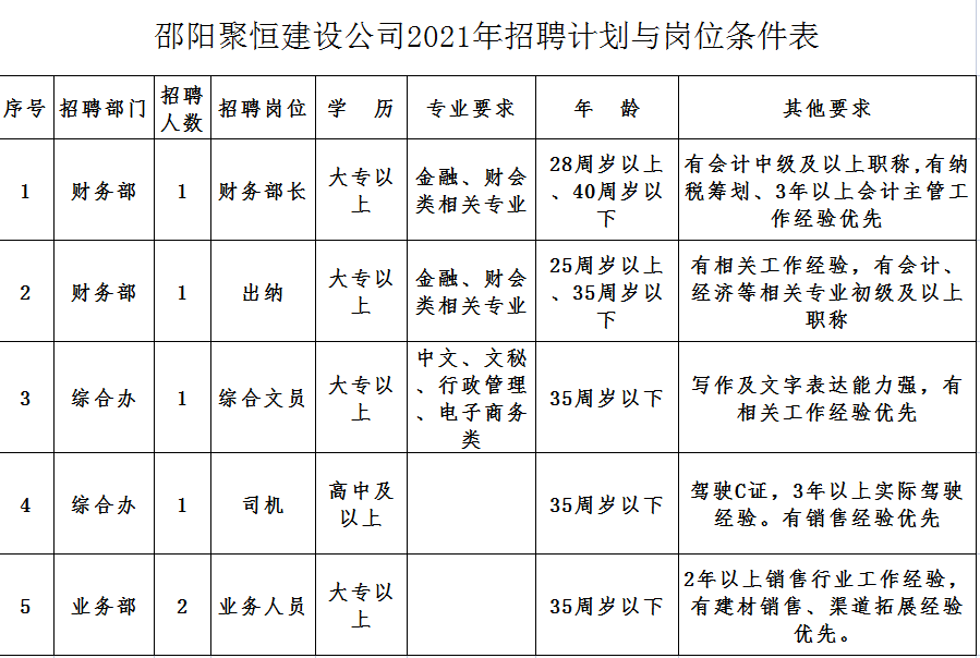 附件1:邵陽聚恒建設(shè)有限公司2021年招聘計(jì)劃與崗位條件表