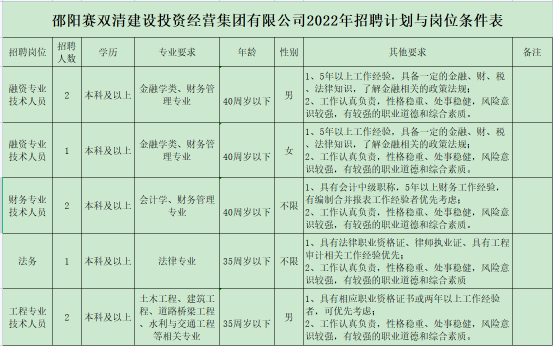 附件1:邵陽賽雙清建設(shè)投資經(jīng)營集團有限公司2022年招聘計劃與崗位條件表